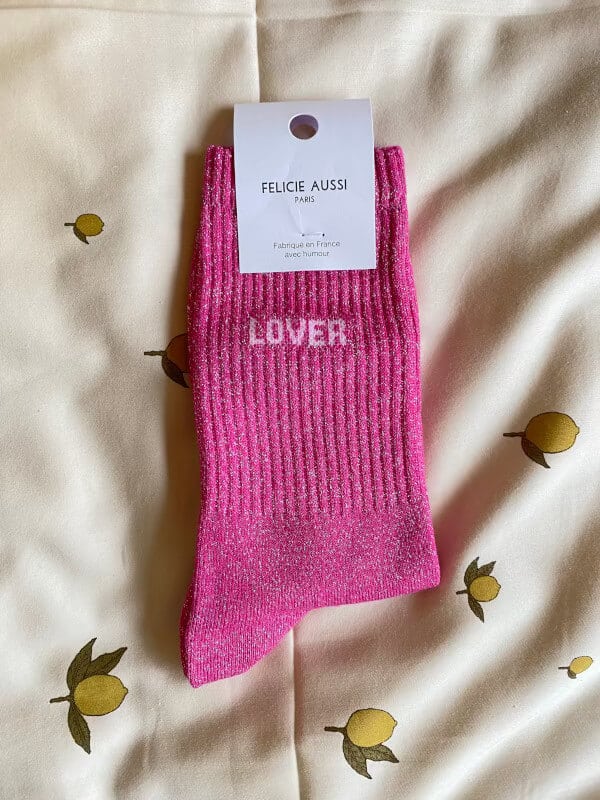 Affirmez votre côté romantique avec les chaussettes de la marque Félicie Aussi ! Notre modèle rose pailleté, avec son message « Lover », est l’accessoire idéal pour les amoureuses. Ces chaussettes pour femme sont pensées pour celles qui aiment la tendresse et la fantaisie.