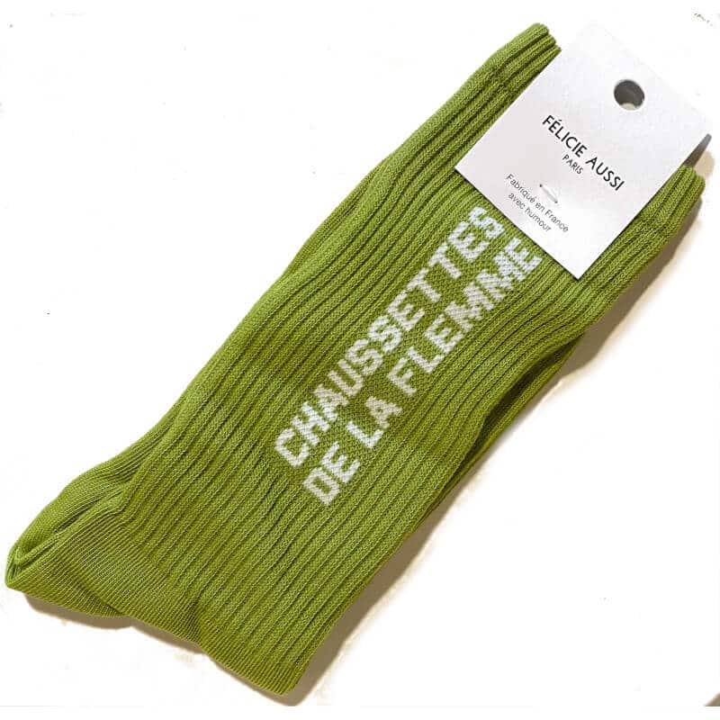 Affichez votre état d’esprit avec les chaussettes de la marque Félicie Aussi ! Notre modèle vert, avec son message « Flemme », est l’accessoire parfait pour les jours où le canapé vous appelle. Ces chaussettes pour homme sont pensées pour ceux qui aiment la détente et l’humour.