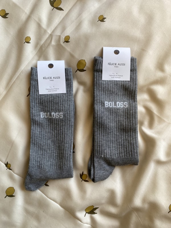 Optez pour l’originalité avec les chaussettes de la marque Félicie Aussi ! Notre modèle pour homme, de couleur grise, arbore fièrement l’inscription « Boloss ».