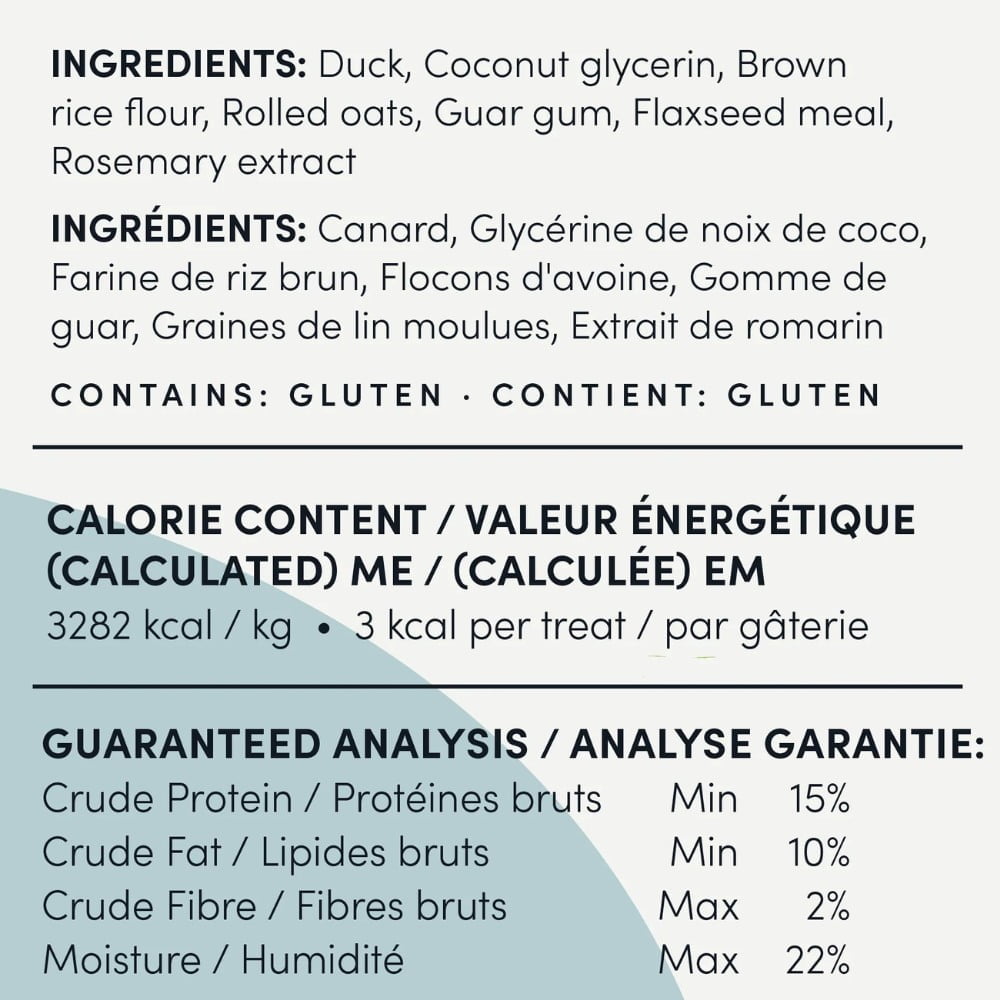 Chaque friandise douce et moelleuse contient tous les ingrédients naturels, à commencer par le canard, ce qui en fait la collation riche en protéines parfaite pour les chiens de tous âges et de toutes tailles. Le canard est une protéine alternative idéale pour les chiens souffrant d’allergies ou de sensibilités alimentaires spécifiques.