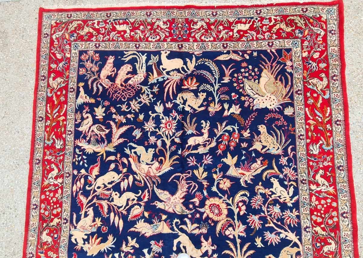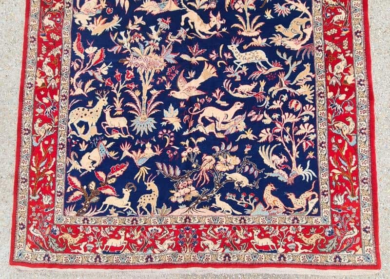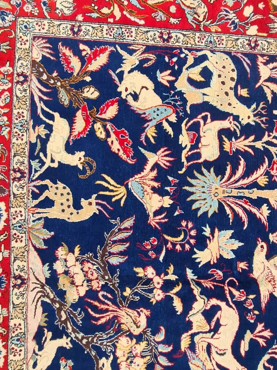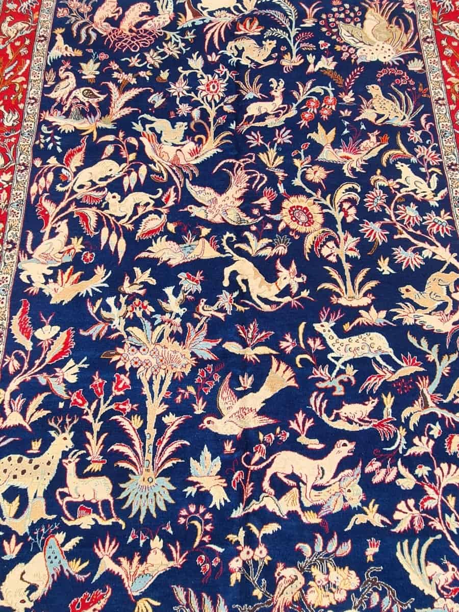 Fond bleu nuit à décor d’animaux, volatiles, tiges fleuries et bouquets de fleurs, dit à décor de « Paradis Terrestre ».
