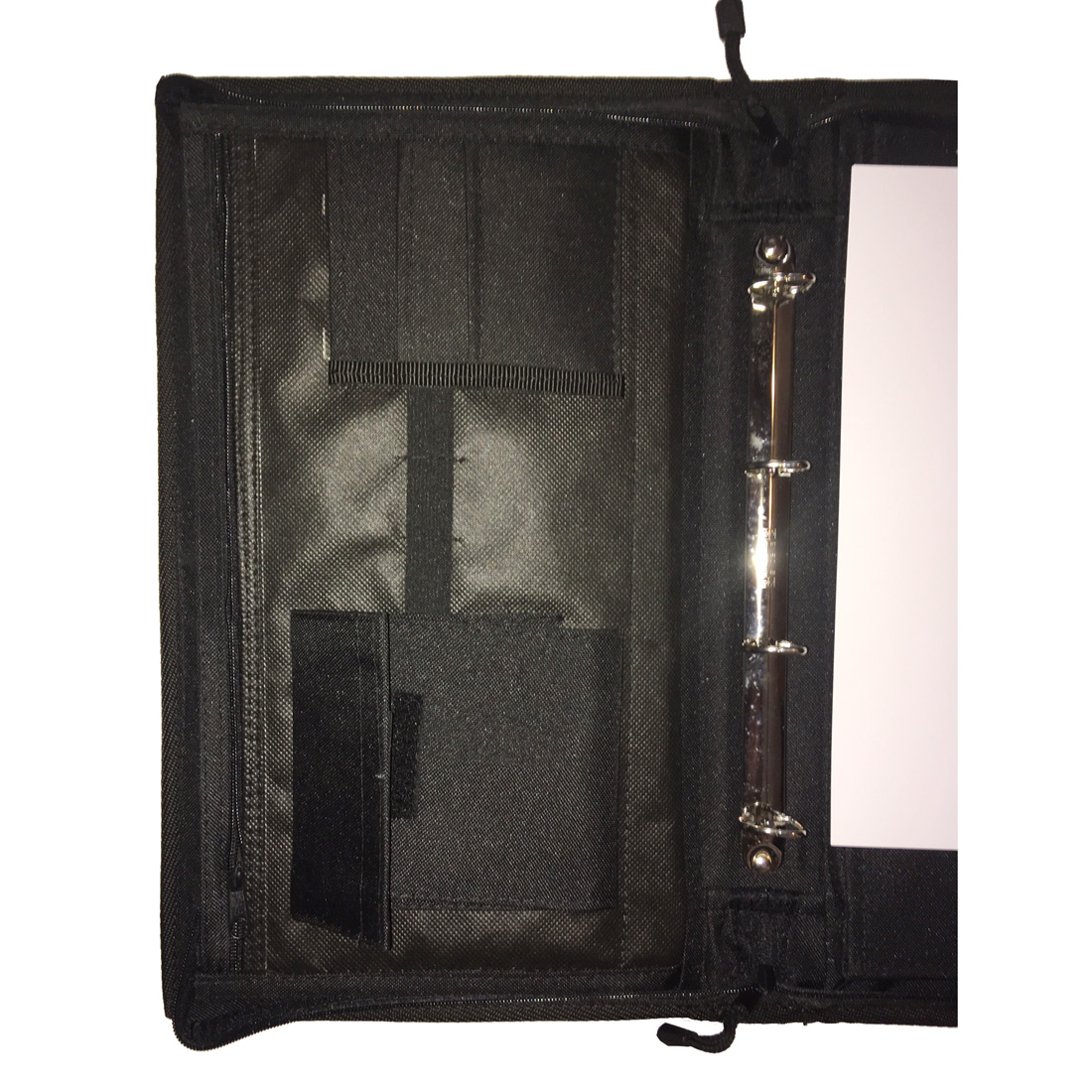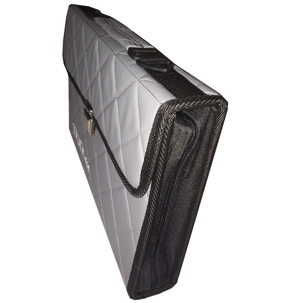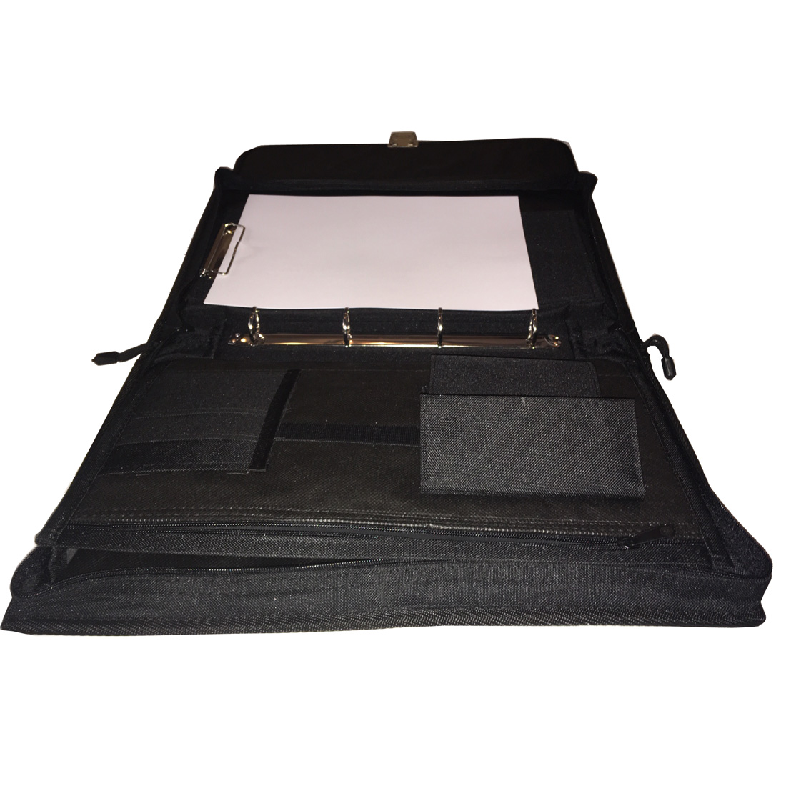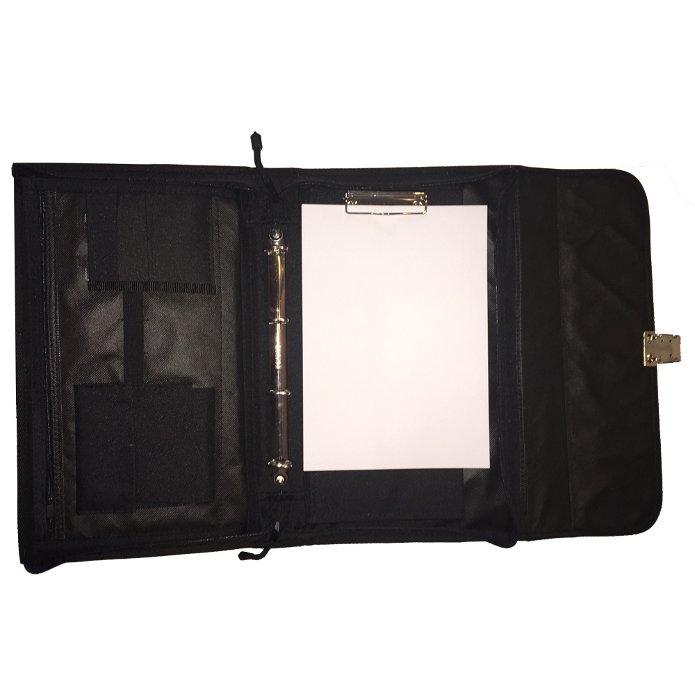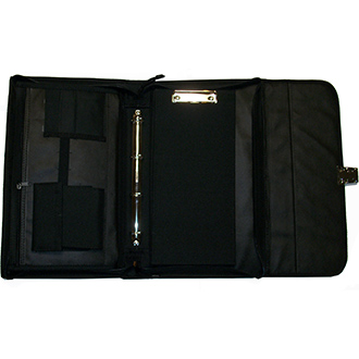 Porte document en similicuir (ou éco-cuir) 43x26x6 cm – Fermeture par clip et par zip – Plusieurs compartiments – Pince pour tenir les documents et anneaux pour les classer – Bandoulière de transport.