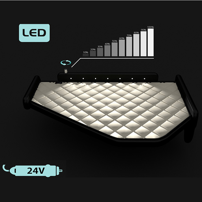 en plaque de bois de haute qualité – S’installe sur le tableau de bord à l’aide de velcros résistants – Possibilité de poser un ordinateur ou un téléviseur – Comporte la prise allume-cigare pour l’alimentation led en 24V.